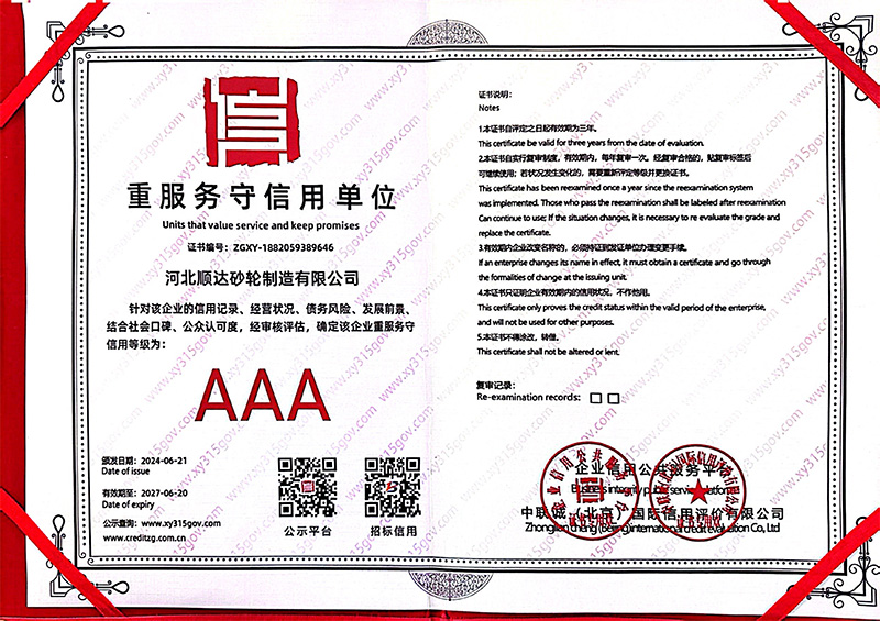 河北顺达砂轮制造有限公司是一家以全系列砂轮制造及科研开发销售为一体的民营企业,公司拥有普通树脂生产线、重负荷砂轮生产线及为生产线后处理的加工设备和齐全的检验设备,产品品质齐全,直径范围40m-760m,厚度范围0.5m-200m,并可对特殊规格或非标准砂轮随时治谈定做,主要产品有平行砂轮、简形砂轮、杯型砂轮、拔行砂轮、弹黄准用砂轮、螺栓砂轮、碗型砂轮、风电磨头、合金不锈钢精细研磨砂轮同时特推出产品经久耐磨,一片顶十片的进口材质锆刚玉砂轮及六十米每秒材质的叠片砂轮,另有多种材质可供客户选择如棕刚玉、锆刚玉、白刚玉、饹刚玉、单晶刚玉、绿碳化硅、黑碳化硅等,力求得到客户真切的认同。